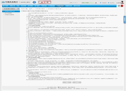 企业网银操作员登录企业网上银行,在【手机银行服务】功能中选择【手机银行开通/关闭】,系统显示【手机银行服务协议】。