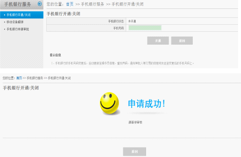 点击【同意】后,系统显示操作员手机银行开通状态及手机号码,点击【开通】,进入手机银行开通申请结果页面。